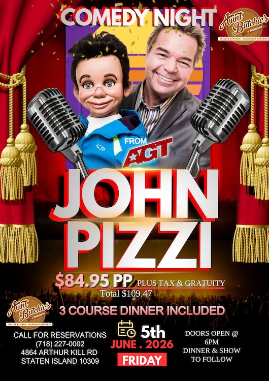 Big laughs. Big stage. One unforgettable night. 🎤😂 Comedy Night with John Pizzi – Friday, June 5, 2026 brings the nationally recognized ventriloquist from AGT to Aunt Butchie’s for an evening of nonstop entertainment, personality, and crowd-pleasing comedy — plus a full 3-course dinner experience included.